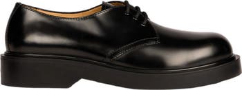 Patent leather derbies with laces and a thick round toe.