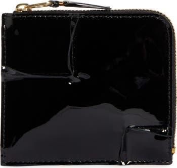 Crafted in Spain from glossy patent leather, this compact wallet features a divided interior with a center pouch for stashing cards or spare change.