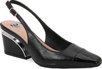 These stylish slingback pumps feature a bold color-blocked design with a pointed toe and a chunky heel