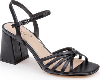 A slightly flared block heel heightens the modern elegance of a strappy sandal complete with a comfort-cushioned footbed.