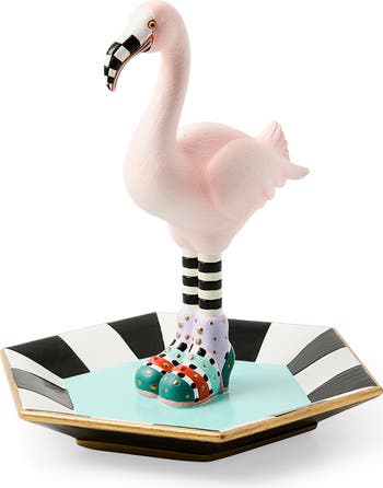 Keep your keys and favorite trinkets in this eye-catching dish featuring a perfectly perched flamingo with black-and-white check and stripe accents and wearing elaborately designed shoes.