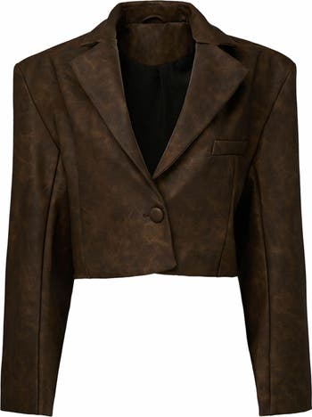 - Featuring a unique patina to give it an aged look, this vegan leather blazer is tailored for an oversized, structured fit with padded shoulders. It has a single-breasted front closure and a row of buttons at each cuff. Oversized fit Shoulder pads Front button closure Sleeve buttons 100% Polyurethane Machine wash cold with like colors. Only non-chlorine bleach when needed. Tumble dry low iron cool.