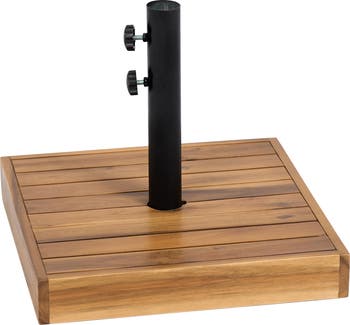 - Compatible with a Wide Variety of Umbrellas: Capable of fitting a patio umbrella with a diameter under 7' and pole diameters of 1.25 or 1.5", suitable for a wide range of outdoor setups, ensuring a secure patio umbrella to keep you shadedStable Umbrella Base: Concrete-filled base offers 42 lbs. of weight to keep your umbrella stable while the steel pole receptacle holds your sun umbrella securely in placeAdjustable Knobs: Our patio umbrella stand includes two hand-turned tightening knobs for securing your umbrella pole to the base and ensuring a snug fitElegant Design: Rustic slated acacia wood grain exterior makes this patio concrete umbrella base an excellent accent piece for your patio, porch, yard, or gardenOutdoor Umbrella Base Info.: Overall Dimensions: 17.7" L x 17.7" W x 15.4" H