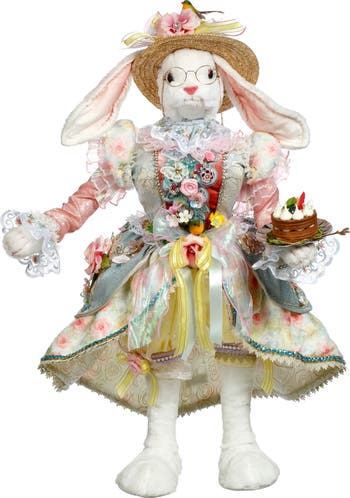 The Mark Roberts Patisserie Rabbit stands 33.5 inches tall, charmingly dressed in a soft pastel-colored dress and topped with a whimsical hat accented by a delicate bird. She gracefully holds a beautifully crafted cake, evoking the elegance and sweetness of a classic patisserie scene. Every detail showcases Mark Roberts’ signature artistry, making this rabbit a delightful statement piece for spring or Easter décor.