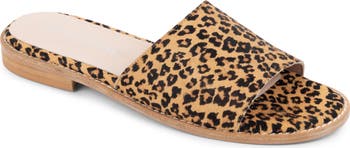 Leopard-spotted calf hair energizes the look of a streamlined slide sandal fashioned with a lightly cushioned footbed.