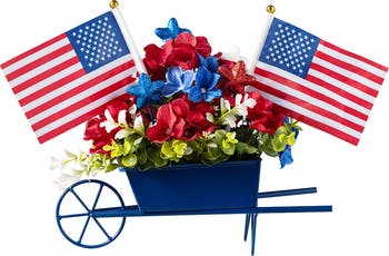 This 14"L patriotic metal wagon centerpiece is perfect for sprucing up your table. The cute blue metal wagon is filled with vibrant red and blue hydrangeas, plus sparkly stars and two mini American flags. Whether you're hosting a 4th of July party or just want to show off your patriotism, this centerpiece will add a festive, all-American touch to any space.