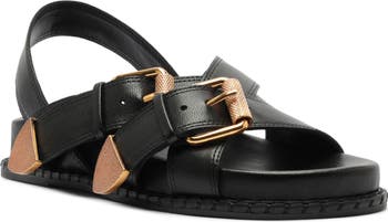 Richly textured hardware lends a flash of rebellious shine to a strappy sandal designed with arch-support cushioning for all-day comfort.