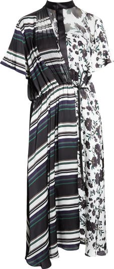 Chitose Abe's penchant for hybrid designs is displayed in this pleat-accented dress pieced with contrasting striped and floral prints interspersed with sheer panels of each. Satiny trim highlights the placket and neck, while a faux-leather drawcord cinches the waist.