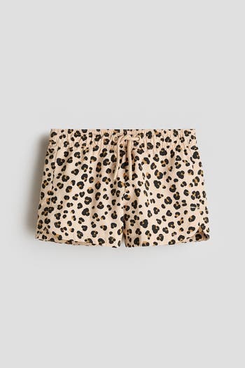 Patterned swim shorts with an elasticated, drawstring waist and gently rounded hems with a small slit on one side. Inner shorts in soft mesh.