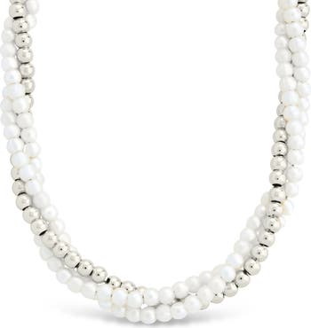 Rhodium-plated beads and dainty faux pearls put a polished twist on this dimensional collar necklace that layers elegantly or shines solo.