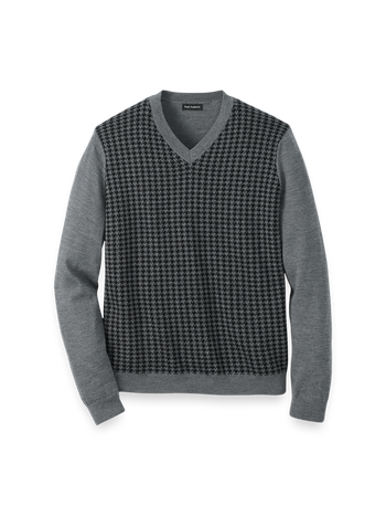 Experience timeless style and comfort with the Washable Merino Wool Houndstooth V-neck Sweater. Crafted from pure merino wool, this long-sleeve pullover features a classic houndstooth pattern and a flattering V-neck. Fully fashioned for a superior fit, it includes ribbed cuffs and bottom for added detail. Easy care: machine wash cold inside out, lay flat to dry. Imported quality meets effortless elegance.