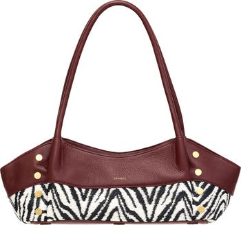 Sleek studs and mixed textures highlight the East-West profile of a fierce shoulder bag suspended from a pair of rolled straps for comfortable carry.