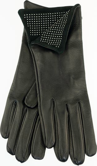 Studded cuffs can be folded up or down on these supple sheepskin leather gloves that prove rock and roll doesn't slow in the cold. Silk lining adds another layer of luxury.