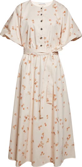 Joseph Altuzarra takes a page from his love of literature with this flowy shirtdress, where scattered petals mimic the look of dried flowers pressed between the pages of a book. Voluminous puff sleeves add romance to the silhouette, while a tie belt cinches the waist.