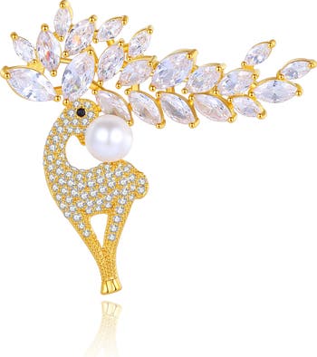 This brooch features pavé glisten round cubic zirconia body, pavé marquise cut cubic zirconia antlers, a luscious shell pearl and a distinguished polished finish. It can be worn as a stylish brooch or as a pendant necklace, completes any look with a holiday sparkle and shine.