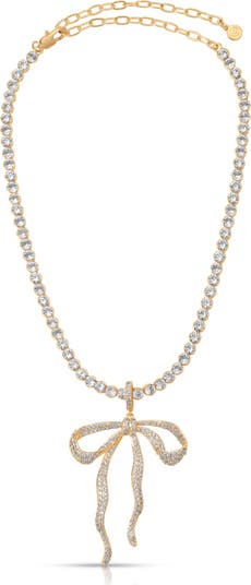 Wrap up your party looks with this organically shaped bow pendant necklace plated in warm 18-karat gold and illuminated by sparkly pavé cubic zirconia.