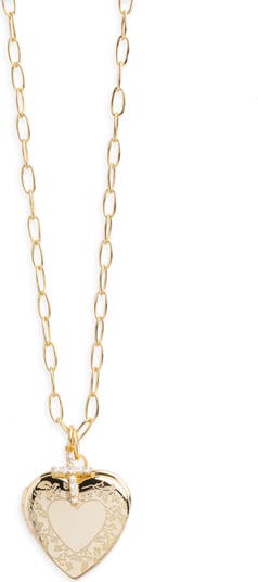An engraved heart locket and pavé cross charm bring romantic sparkle to an 18-karat gold plated necklace anchored by an open-link chain.