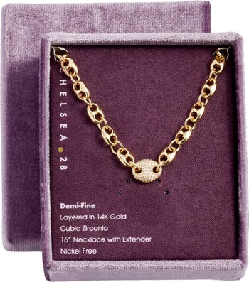 Pavé cubic zirconia glimmer at the center link of this mariner-chain necklace layered in 14-karat gold.