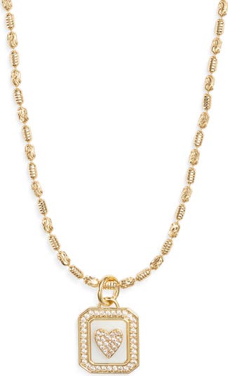 Pavé cubic zirconia bring glittery romance to this mother-of-pearl pendant necklace layered in 14-karat gold.