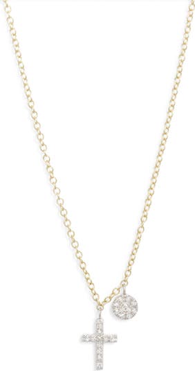 Glittering diamonds illuminate the cross pendant and charm on this delicate 14-karat gold chain necklace that will serve as an everyday expression of faith.