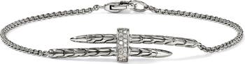 Signature carvings distinguish the threaded spear pendant on this handcrafted rolo-chain bracelet glinting with pavé diamonds.