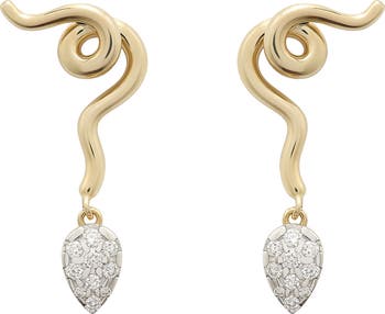 Pavé diamonds twinkle at the teardrop tips of these swirling, vine-like drop earrings cast in 9-karat gold.