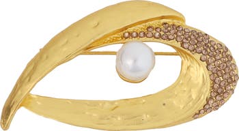 Sculptural curves are accented with pavé crystals and a luminous faux pearl on this elevated brooch plated in 14-karat gold.