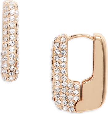 A half pavé split adds glowing contrast to the polished half of these rectangular huggies.