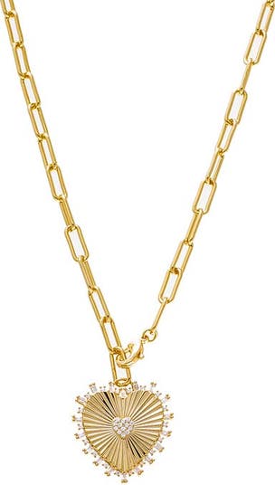 Introducing our captivating Pave Accented Ridged Heart Pendant Lariat, a symbol of elegance and love. Crafted from durable brass and plated with radiant 14K gold, this lariat necklace features a heart pendant adorned with sparkling pave accents and a ridged design for added texture. Suspended from a chic paperclip chain, it exudes modern sophistication. With a heart size of 15mm and a length of 17 inches, it's the perfect accessory to elevate any ensemble. Add a touch of glamour and romance to your look with this exquisite piece today!
