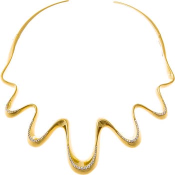 Show up and shine in the Pave Accented Squiggly Collar Necklace by Adina Eden, a playful yet polished Necklace. Clean lines and brilliant hues define this cute necklace for women, available in Gold for effortless layering. Every day is different—this effortless layer adapts to your mood, your outfit, and your pace—no questions asked. Layer this gold plated necklace with selections from the Chain Necklaces collection for a full look that feels intentional. Goes with everything and still manages to stand out.