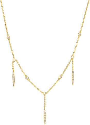The Pave Dangling Dagger Charms Chain Necklace by Adina Eden brings simple elegance to your jewelry rotation with this standout Necklace. Bold or understated, this women's fashion necklace comes in Gold to suit your vision. For anything on your calendar, this piece lets you feel confident and complete—like the final touch your look didn't know it needed. Complement this gold plated necklace with selections from the Tennis Necklaces collection to build a signature look you'll love. Made to match your pace, your plans, and your style.
