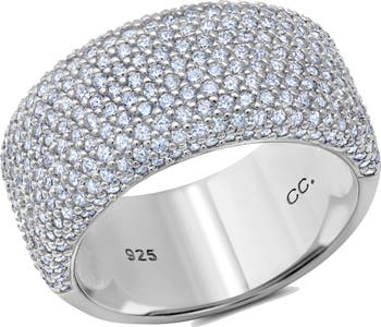 Sparkling rows of round-cut cubic zirconia light up this gleaming half-eternity ring styled in a wide band with platinum plating.