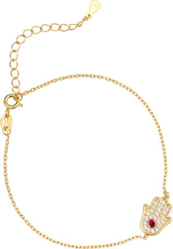 Bring meaning and elegance to your wrist with this delicate Gold Hamsa Hand Bracelet. Symbolizing protection, blessings, and good fortune, the Hamsa hand charm is beautifully encrusted with sparkling white crystals and features a striking ruby-red center stone for a pop of color. The adjustable gold chain ensures a comfortable fit, making it perfect for everyday wear or as a thoughtful gift