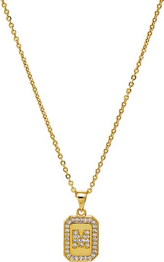Adina Eden’s Pavé Initial Dog Tag Pendant Necklace is a personalized and stylish accessory, crafted from brass and plated in 14K gold. Adorned with clear CZ stones, the pendant measures 9mm by 12mm and is available in all letters from A to Z, allowing you to customize it with your initial or a loved one’s. The necklace features a 16-inch chain with a 2-inch extender for adjustable length, making it a perfect piece to wear solo or layered for a chic, meaningful touch.