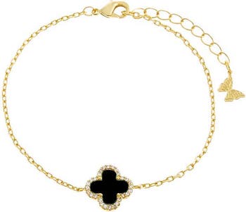 Embrace good fortune with the Pave Outlined Four Leaf Clover Bracelet. This elegant piece is crafted from brass and plated with 14K gold, featuring a charming four-leaf clover design. Each clover is adorned with clear CZ stones, adding a touch of sparkle. Choose from four stunning natural stones—Mother of Pearl, Onyx, Malachite, or Turquoise—to complement your style. Measuring 12 MM, the clover is delicately placed on a bracelet with a length of 6" plus a 1" extender, ensuring a perfect fit and an adjustable length for versatile wear.