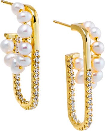 The Pave Paperclip & Pearl Open Hoop Earring from Adina Eden is a stunning piece crafted from brass and plated in 14K gold. The earrings feature a beautiful combination of clear CZ stones and faux pearls, with the pearl hoop measuring 15mm x 19mm and the paperclip-shaped design at 12mm x 30mm. The pave detailing adds a touch of sparkle, making these earrings both elegant and eye-catching. With a post back, they offer a secure fit and are perfect for adding a chic, modern twist to any look.