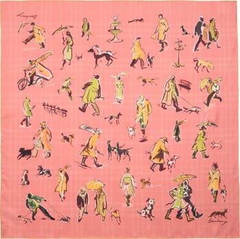 A scarf made in Italy from silk twill, printed with the Burberry Check and a seasonal tribute to Britain’s love of dogs. The hand-drawn artwork depicts breeds including Dalmatians, Dobermanns and Jack Russells alongside owners wearing signature Burberry silhouettes.||Square|Hand-rolled edges|Printed Burberry lettering