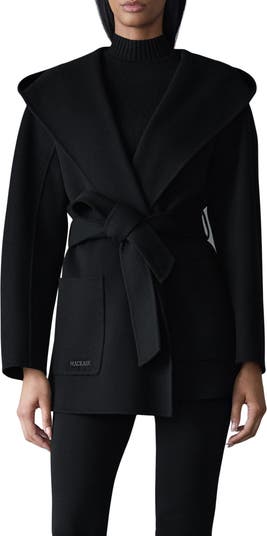 A voluminous cloak-inspired hood and softly tailored silhouette shaped with a belt refine the fit of this rich wool coat flanked by deep patch pockets.