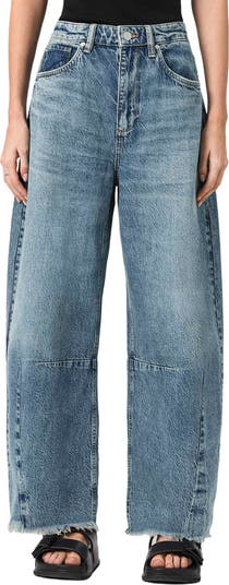 Complete your look with the lived-in attitude of these nonstretch-denim jeans featuring frayed hems and a faded and whiskered finish.