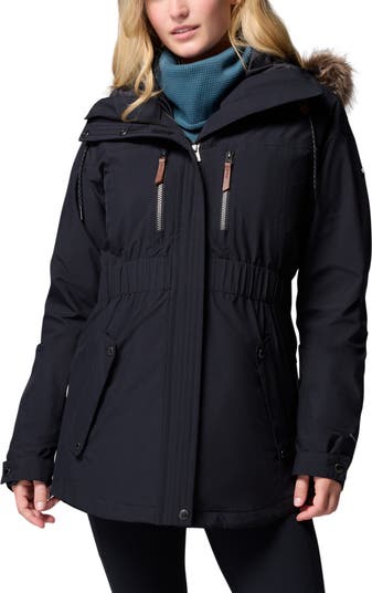 - Drawcord hood with fleece lining and removable faux-fur trim