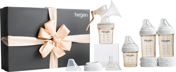 The gift set that defines everything Hegen stands for. Express-Store-Feed within a single container with no wasteful transfer of milk necessary! Perfectly curated for newborns, this gift set allows mothers to kickstart their breastfeeding journey and indulge in the full Hegen experience. Simply attach the manual breast pump to express directly into our Hegen PCTO™ Breast Milk Storage PPSU, then swap the lid with a Hegen PCTO™ Breast Milk Storage Lid, instantly converting it into an air-tight storage container for storage in the chiller or a storage bag. To feed, simply reheat to desired temperature and change the lid to our feeding top for convenience and no wasteful transfer of milk. Everything happens within a single container, minimising wastage and making every drop count. What's Included: 1 x Hegen PCTO™ 150ml/5oz Feeding Bottle 1 x Hegen PCTO™ 240ml/8oz Feeding Bottles (2-pack) 4 x Hegen PCTO™ Breast Milk Storage Lids White 1 x Hegen PCTO™ 22mm Manual Breast Pump Kit (SoftSqround™) 1x Hegen Bottle Brush & Nipple Cleaner