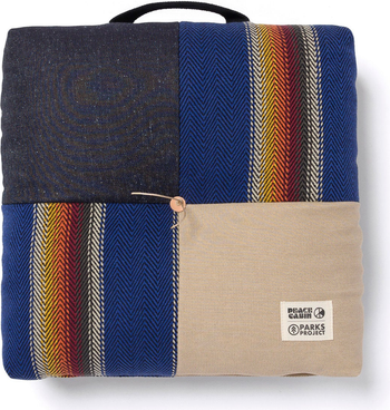 This cushion is perfect for relaxing at dusk. Handmade by a husband and wife team in Pennsylvania, it combines mixed textiles with a rugged base and a cotton webbing handle for versatile use.
