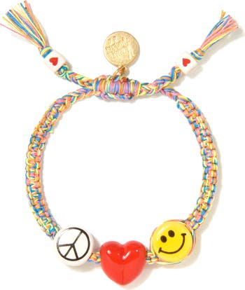 Introducing our Peace, Love, and Happiness Bracelet - the perfect accessory for spreading positivity! Featuring a peace sign, heart charm, and smiley face, this friendship bracelet is a fun and stylish way to express your love for all things groovy. Peace out!