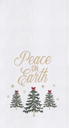 Spread the season's cheer with this Peace On Earth Forest Flour Sack Kitchen Towel. Imagine a forest of festive Christmas trees adorned and sparkling with delicate red bows, highlighted with a beautiful golden traditional script wishing peace on earth, making it a perfect design for the holiday season years after years.