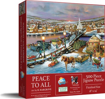 Immerse yourself in the magic of the holiday season with the Peace to All 500 Piece Jigsaw Puzzle. Renowned artist H. Hargrove's serene winter village scene, reproduced on an 18" x 24" puzzle, sets the stage for a mesmerizing afternoon of intricate craftsmanship and relaxation. Made from high-quality recycled cardboard, each piece snugly interlocks for a flawless finish. This puzzle from SunsOut Puzzles, a woman-owned small business, is proudly made in the USA with a commitment to local craftsmanship and high manufacturing standards. The eco-friendly approach extends to their use of soy-based inks and top-quality recycled board, blending durability with sustainable practices. If you encounter any missing or damaged pieces, you can rely on SunsOut's exceptional customer service for a worry-free experience, assured by their guarantee of excellence. Celebrate the holidays and foster unity by spending cozy winter afternoons piecing together this enchanting jigsaw puzzle, creating lasting memories while reveling in the joy of holiday cheer.