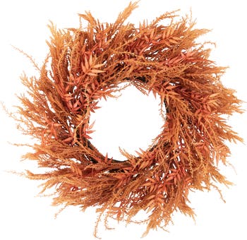 Bring the beauty of pampas grass indoors with this stunning peachy wreath. This popular grass is a must have for late summer into autumn decorating. The deep peachy plumes will make a statement in any decor. Perfect for doors or mantles. Product Features Peachy pink pampas grass wreath Bendable wire branches Ready-to-hang from a sturdy twig ring backer Recommended for indoor use - if using outdoors place under a covered area Dimensions: 24” diameter (measured from outermost tip to outermost tip across the wreath) Material(s): plastic/wire/metal