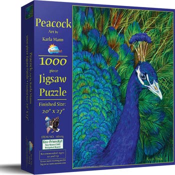Step into the vibrant world of nature with the Peacock 1000 pc Jigsaw Puzzle by SunsOut, an exquisite piece of art by Karla Mann that captures the majestic beauty of peacocks in their full glory. Known for their unrivaled craftsmanship and quality, SunsOut Puzzles are constructed to perfection. Each puzzle features precision-cut interlocking pieces crafted from high-quality recycled cardboard, promising a perfect fit every time. The fully licensed artwork by Karla Mann is a masterpiece in itself, with rich tones and intricate details bringing the peacock's elegant feathers and vivid colors to life. Assembled from eco-friendly soy-based inks and premium recycled materials, this puzzle is as conscious of the environment as it is enjoyable to piece together. Made in the USA, SunsOut Puzzles reflect a commitment to quality standards and support a woman-owned small business. Whether you're looking for a leisurely and enriching personal pastime or a beautiful and thoughtful gift for a loved one, this puzzle masterfully marries beauty, challenge, and leisure. Immerse yourself in the splendor or gift the joy of piecing together a work of art with the Peacock 1000 pc Jigsaw Puzzle.