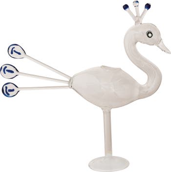 - A handmade glass vase shaped like an elegant peacock, with a sleek silhouette and a luminous blue and clear finish