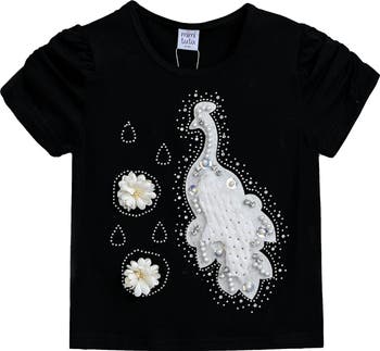 The Peacock Applique T-Shirt is a vibrant and fun addition to everyone's wardrobe. This soft cotton t-shirt features a charming peacock applique, adding a touch of whimsy and color. The round neck and straight hem ensure a classic and comfortable fit, while the short puff shoulders provide a playful and stylish look. The straight hem offers a neat and simple finish, making this t-shirt versatile and easy to pair with various outfits.