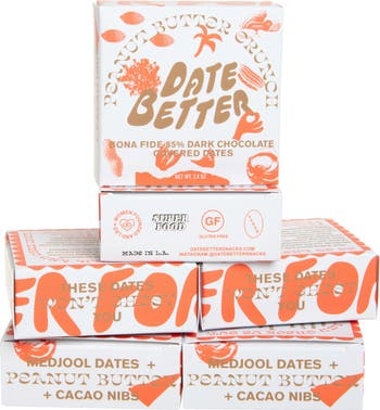 Upgrade your snacking game with chewy, stuffed Medjool dates covered in 85% dark chocolate and made with less than one gram of added sugar. Peanut Butter Crunch features a filling of thick peanut butter, a speckling of crunchy cacao nibs and a coating of organic, fair-trade 85% dark chocolate free from any soy or emulsifiers.